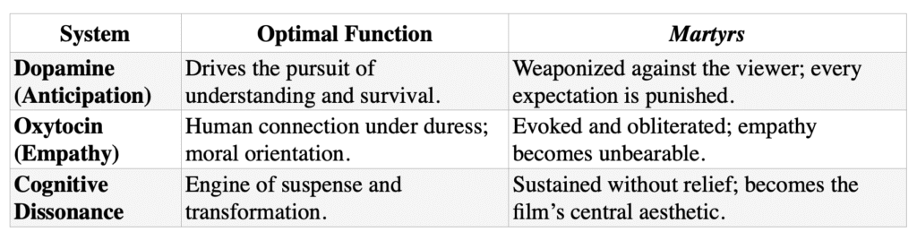 Where most horror externalizes fear through survival and resolution, Martyrs inverts the formula, inviting its audience into dissonance without the promise of relief by constructing a narrative field in which the only possible resolution is transcendence. This is where an oxytocinic and dopaminergic inversion occurs, pain becoming revelation, and horror a conduit for meaning.