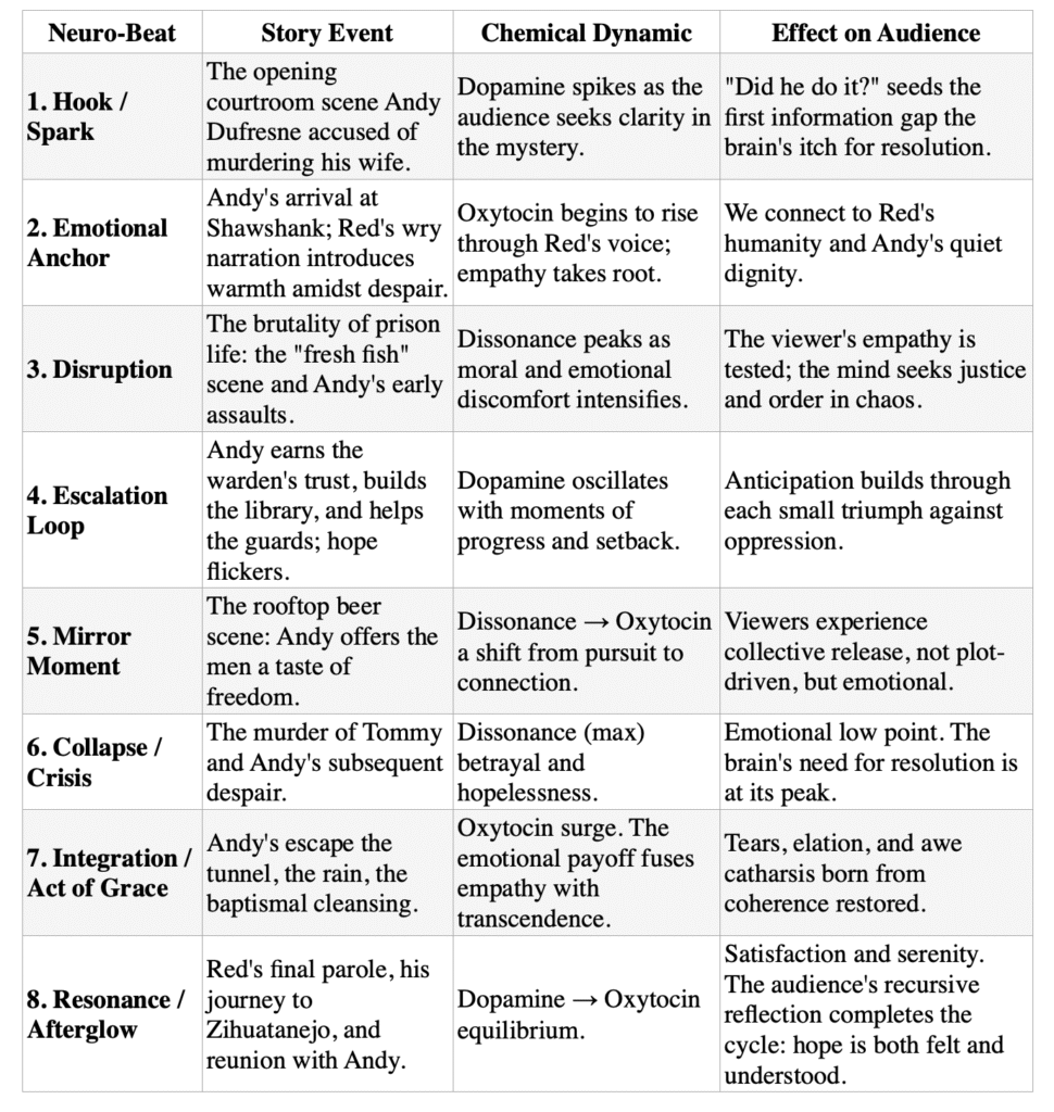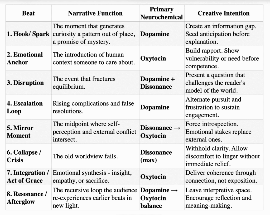 To visualize this chemical choreography, we can adapt the traditional beat sheet into a neuro-narrative map. This framework plots the story’s progression not just as a series of events, but as a sequence of targeted emotional and cognitive states.