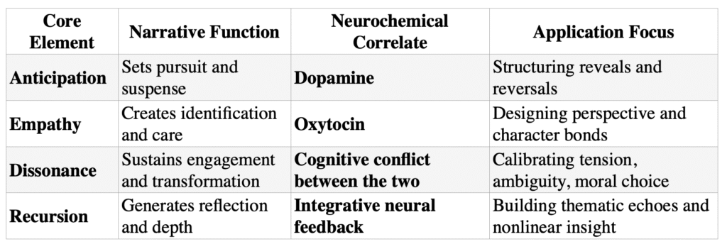 Traditional structure charts plot the rise and fall of conflict; this model plots the rise and fall of neurochemical states, resulting in engagement. In this way, story design becomes neuro-architecture, a choreography of curiosity, empathy, and unease through dissonance.