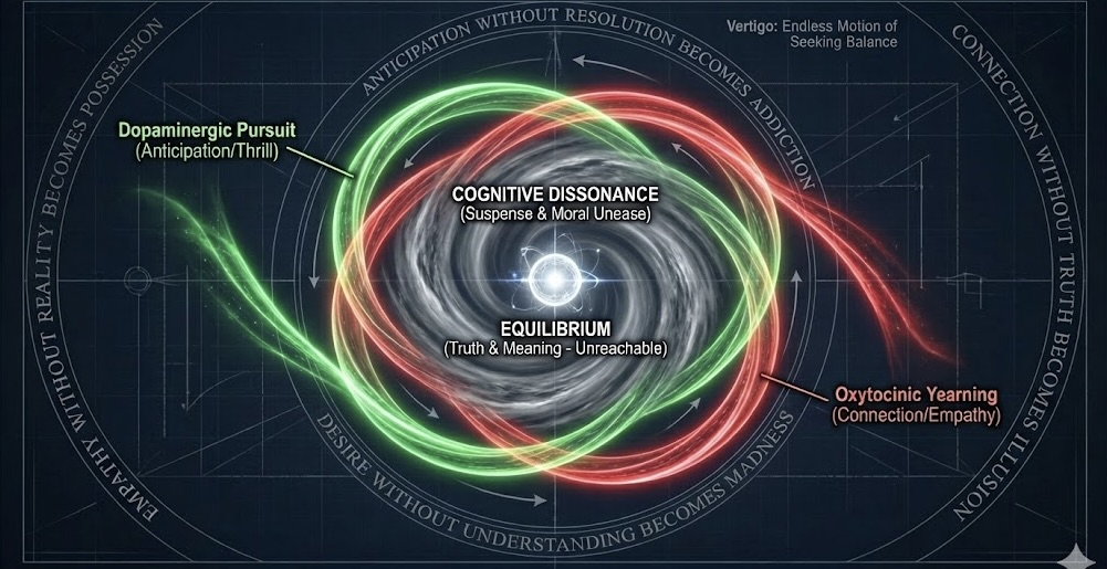 In neuroscientific terms, Vertigo operates as an oscillation between dopaminergic pursuit and oxytocinic attachment. Scottie’s fascination with Madeleine stimulates the anticipation loop: the thrill of the chase and the mystery to be solved posed by old school chum, Galvin Elster. Yet the deeper he falls into obsession, the more empathy collapses into possession — an irony considering Elster’s “revelations” shared with Scottie. Dissonance escalates as dopamine’s drive for pattern and completion outpaces oxytocin’s stabilizing connection. The result is an unbalanced circuit, a recursive feedback loop of longing and loss.