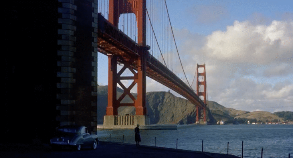 Hitchcock’s camera embodies this recursive process. The now-famous dolly-zoom, expanding and contracting space simultaneously, simulates the perceptual distortion of dissonance itself — the mind straining to integrate incompatible information. Every visual return, the same streets, the same flowers, the same mission tower, intensifies the recursion, inviting both Scottie and the audience to revisit the same stimuli with new, destabilizing awareness.