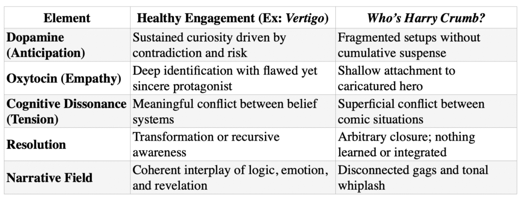 As discussed earlier, in the Unified Theory, cognitive dissonance is the tent-pole of engagement; the “itch that must be scratched.” But in Who’s Harry Crumb?, dissonance is present yet unfocused. The audience senses absurdity but not contradiction as there’s no underlying perspective-driven tension between belief and revelation, or between self and shadow.